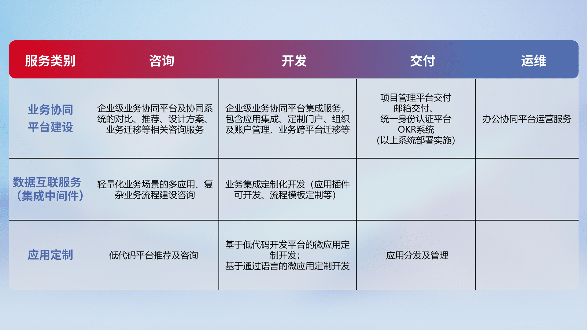 针对钉钉、、企微、、、IDaas等平台级产品提供产品的规划、、方案、、、交付、、、、定制化开发等服务,,,,实现如统一协同办公、、、、智能客户服务、、、混合会议管理、、、、智能数据查询、、等业务场景,,,实现数字化转型。。。。